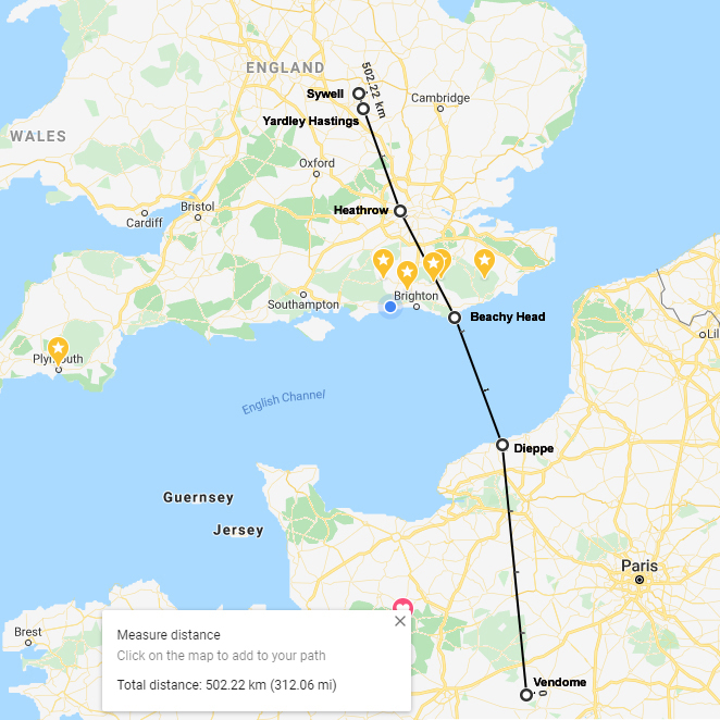 He flew in the direction of the moon (which was in a southerly direction) for some ten minutes, then he decided it might be prudent to wait for morning. He landed in the half light of dusk and tried to sleep….Bryn had landed at Chase Farm near Yardley Hastings, eight miles south southeast of Northampton….At first light he took off a second time flying south again. However he had to make another landing to ask a lorry driver for directions….After that his next flight took him over a fledgling Heathrow (when it was in its infancy days) and then south again onto Beachy Head.