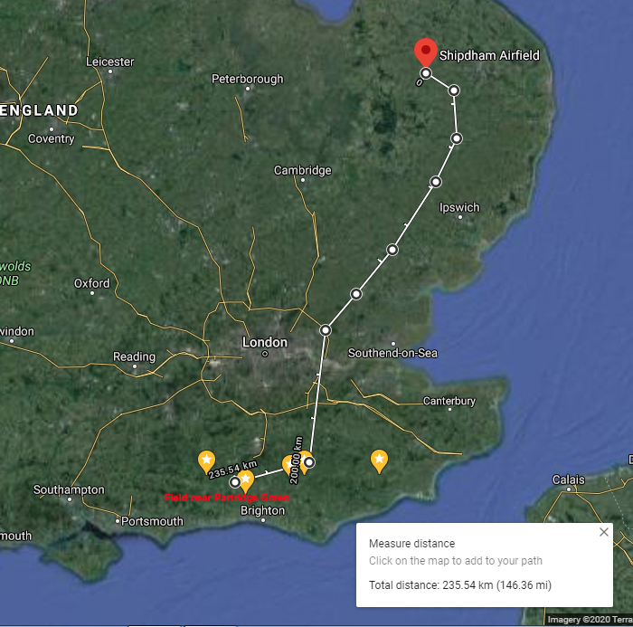 From Crowborough it was all home territory past Uckfield, Haywards Heath and Cowfold. The field that Jim was operating out of is located west of Cowfold before Buck Barn and the A 24. It was just south of the A272 stretch between Cowfold and Buck Barn.