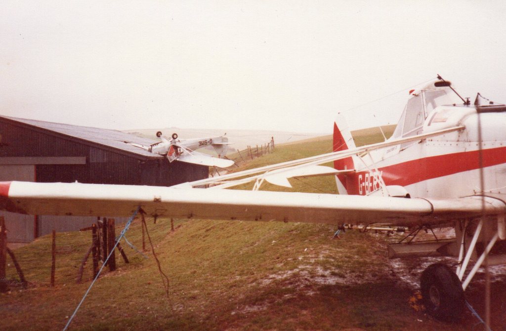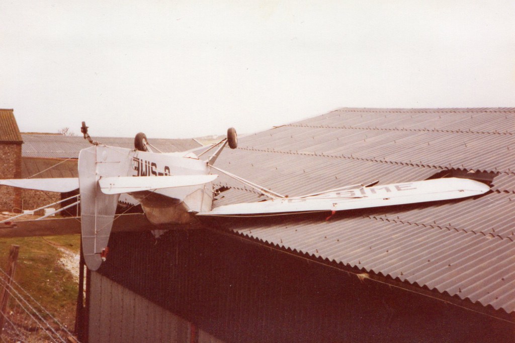 In November of 1985 the Auster was blown onto a barn roof during a gale whilst it was parked up and tied down at Cornish Farm, off Beachy Head. So ironically G-SIME met its fate at Beachy Head. The very place Bryn departed British soil in 1950.