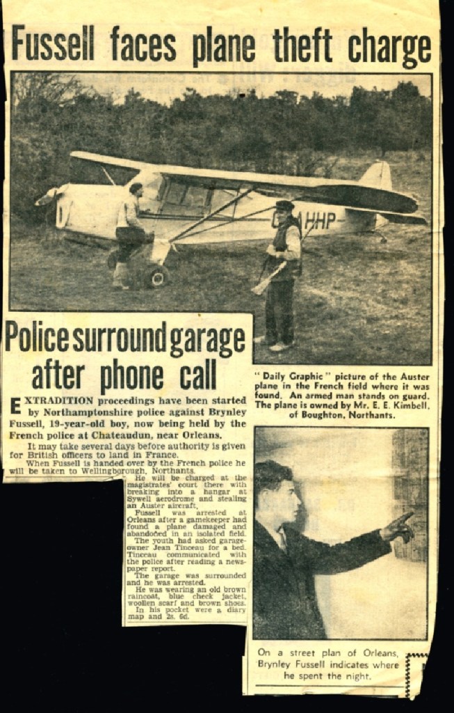 An incorrigible criminal “Brynley Fussell” 19years old, had broken out of Borstal (for the ninth time), stolen an aircraft and without benefit of lessons flown it to France, taking off at night and landing four times along the way. Armed only with knowledge gleaned from books and magazines… Fussell had ‘borrowed’ (his words) not just any aeroplane but an Auster, a tricky tail-dragger with characteristics that might be deemed undesirable for the first time flyer…Had he not dinged the prop on his fourth landing, he might have got clean away.
