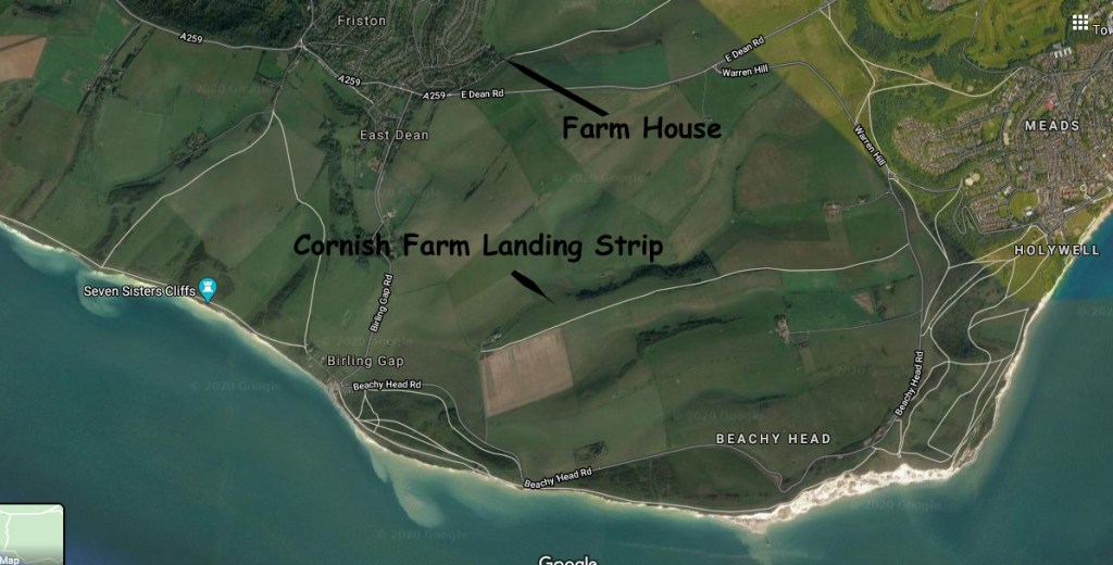 Just to the west of Eastbourne and north of Beachy head there is some council owned land called Cornish Farm. The farm was managed at that time by a friend of mine called Chris Johnson. One of the fields on the farm had for years been occasionally used as a landing strip and I had made use of it a few times so I made the usual flight around the farm house which usually brought Chris out and it did. He jumped into his truck and made for the landing field. Briefing Dick on how we would approach the strip I positioned the Chipmunk west of the field and started an approach to land.