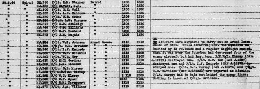 No one in 401 saw him go down that day he is just recorded as missing, (nothing is known) in the summary of their daily events form . Interesting though that here within that daily operations form AIR 27/1774-12 he is listed as Flight Sergeant R D Davidson R.152221. As indeed he was all the way through with 401 squadron.
