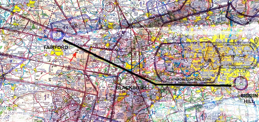 Don hadn’t been chatting much with me over the intercom, mainly due to him talking to a number of different ground controllers on the radio, so I continued marking my map. We then altered our course overhead Blackbush, a distance of 30nm from Biggin, and set course for Fairford. The distance from Blackbush to Fairford is 40nm. In still air and flying at 80knots, this leg was about 30 minutes flight time.
